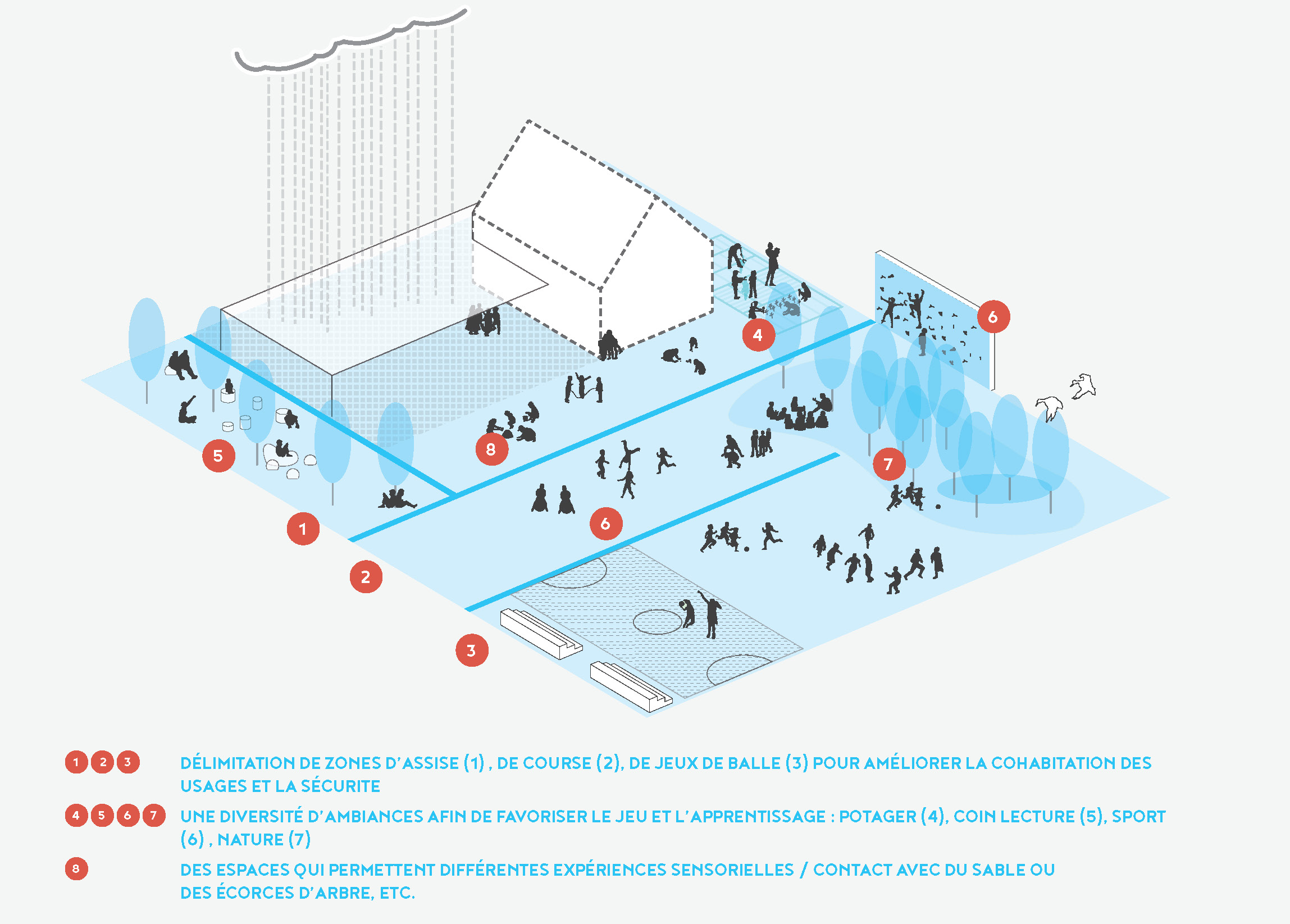 Cours de récréation La cour de récréation doit permettre diverses activités concentrées sur des périodes assez courtes : des jeux calmes ou dynamiques, des discussions ou activités sportives... L’aménagement de sous-espaces aux atmosphères différentes favorise la cohabitation des usages : terrain de sport, espace vert (avec un potentiel pédagogique autour des questions relatives à la nature), potager, coin lecture, etc.