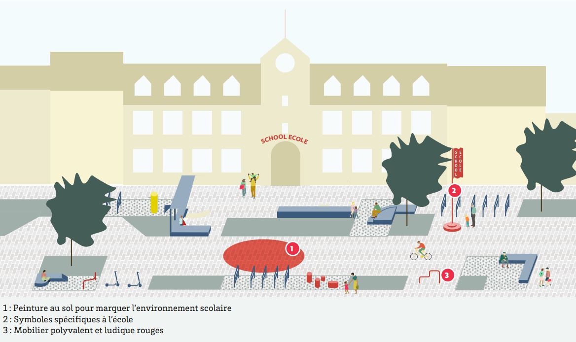 - Analyse du contexte : étudier la situation existante et évaluer les abords de l’école (à l’aide éventuellement du guide « Repenser les abords d’écoles ») ;