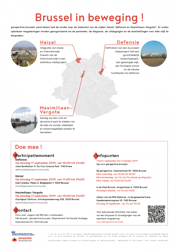 perspective.brussels werd belast* met de studie naar de toekomst van de wijken Heizel, Defensie en Maximiliaan-Vergote. Er zullen openbare vergaderingen worden georganiseerd om de perimeter, de diagnose, de uitdagingen en de doelstellingen voor elke wijk te bespreken.