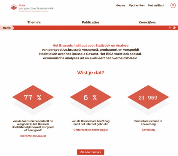 U vindt er alle vertrouwde rubrieken terug, zoals de nieuwsberichten, de thema's en onze publicaties… Maar ook nieuwe content en functies, zoals dynamische grafieken, gedetailleerde pagina's over de opdrachten van het BISA en infografieken met de kerncijfers van het Brussels Hoofdstedelijk Gewest.