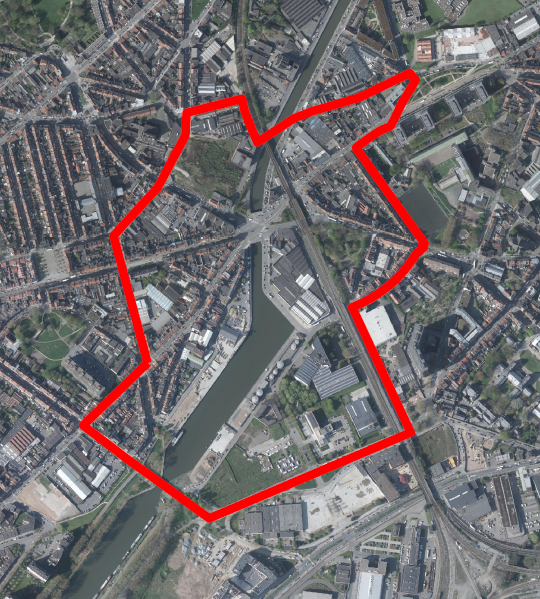De perimeter van het BBP 'Brug van Kuregem', op 28 oktober 2004 goedgekeurd door de regering, werd begrensd door de Pierre Marchantstraat, de Bergensesteenweg, de Doverstraat, de Scheutveldstraat, de Orchideeënstraat, de Hoofdrioolstraat, de Albert I-square, de Bergensesteenweg, de Transvaalstraat, de Kommenstraat, de Prévinairestraat en de Grondelsstraat.
